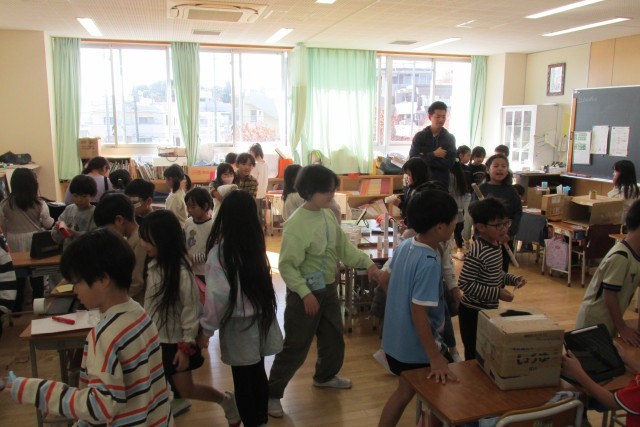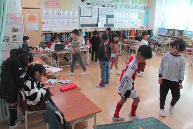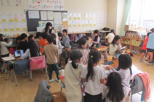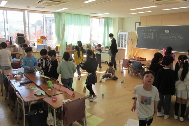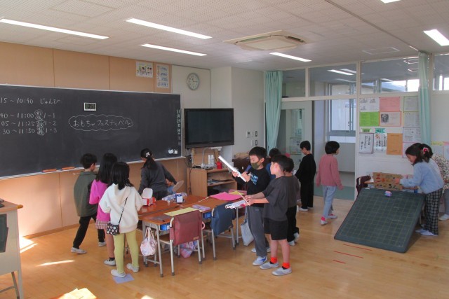 写真は2年各教室で1年2組児童が楽しんでいる様子です。