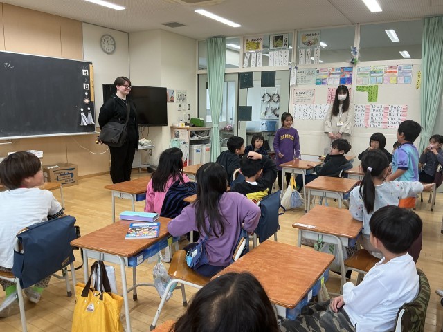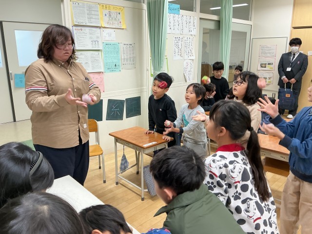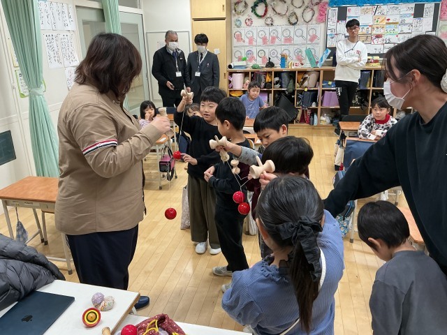 テンプル大学から3名の留学生が来校し、昔遊びや日本の学校でのことについて紹介しながら交流しました。