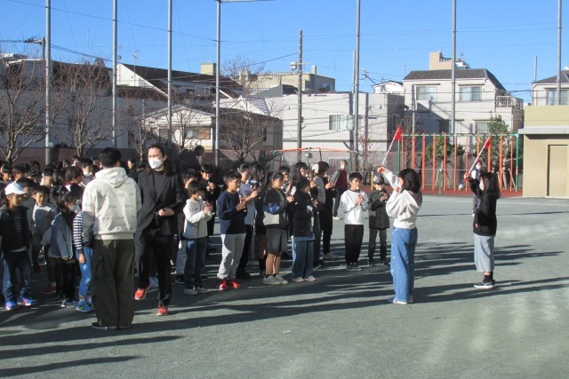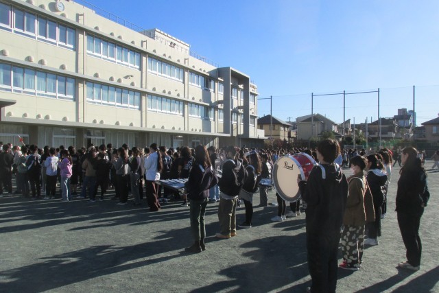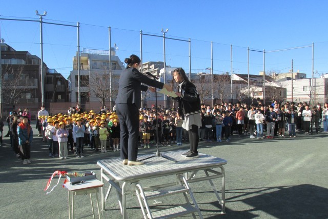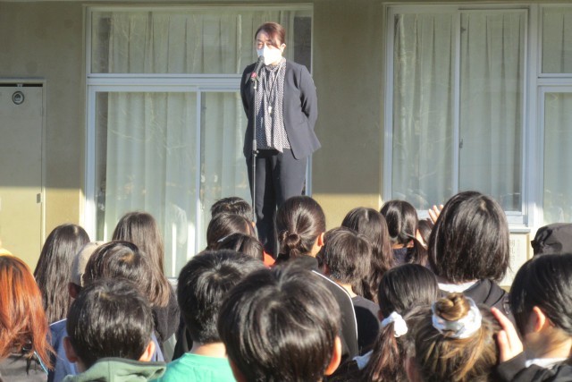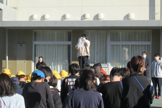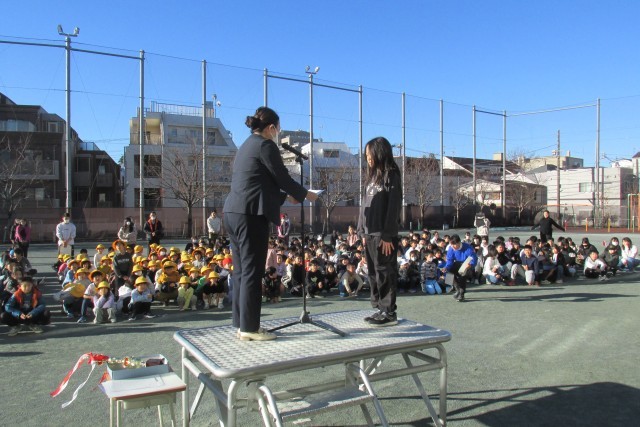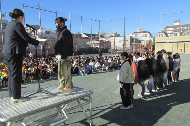 全校朝会の様子です。写真は順に6年生のあいさつ、校長講話(音楽会で成果が発揮できるよう練習に取り組むこと、クラーク博士の「少年よ、大志を抱け」から、人として備えるべきことを成すために目標をもつことが大切である)、表彰、看護当番の教員からの話(今週の生活目標「ルールやマナーを守って歩こう」について)、鼓笛隊演奏、演奏後の振り返りです。