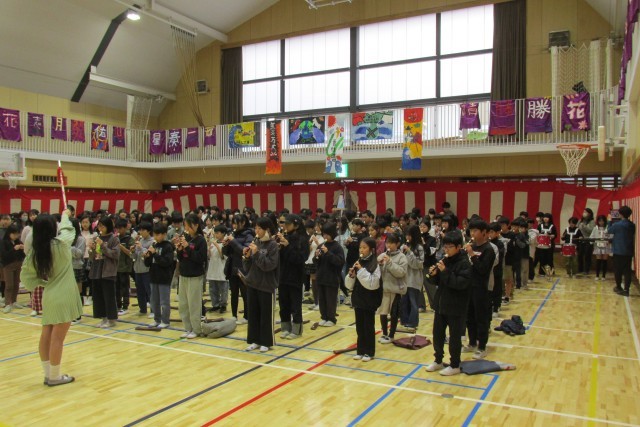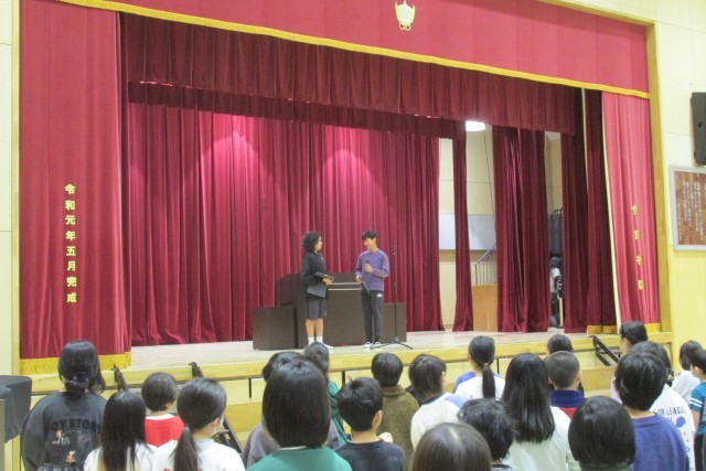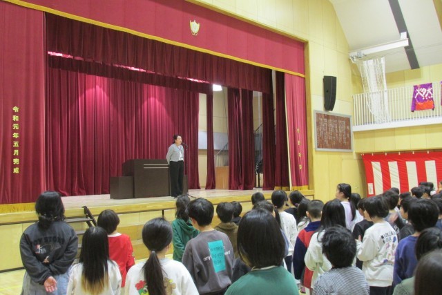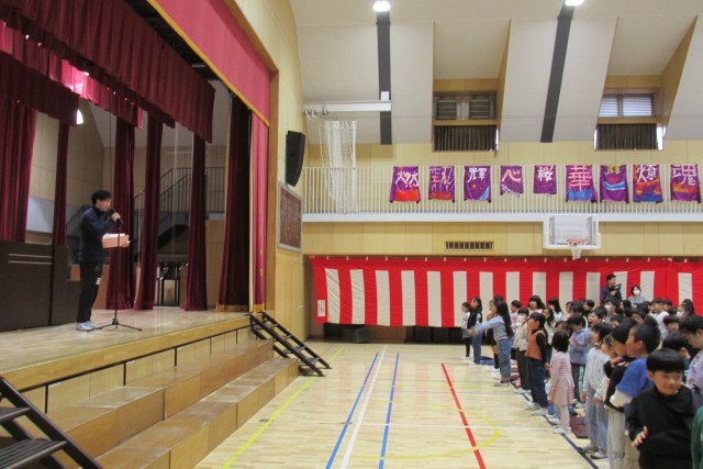 校長講話は春分の日の趣旨説明、日々正しいことを選択し実行することの大切さについて、看護当番の教員より今週の生活目標(「荷物を計画的に持ち帰ろう」)について話をしました。5年生による鼓笛演奏デビューでした。