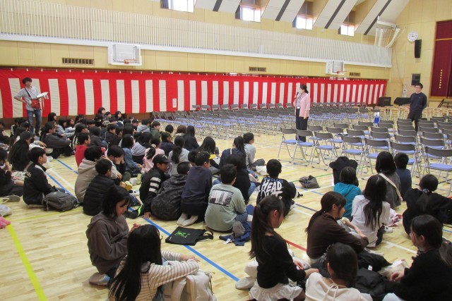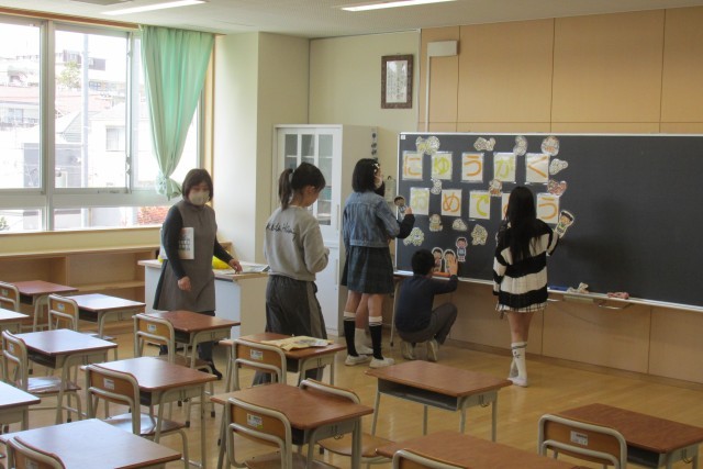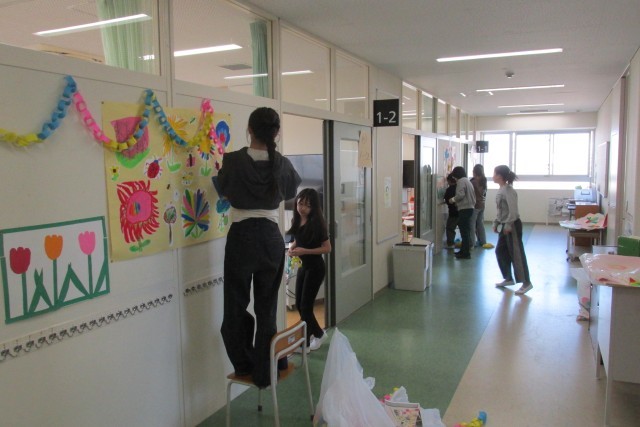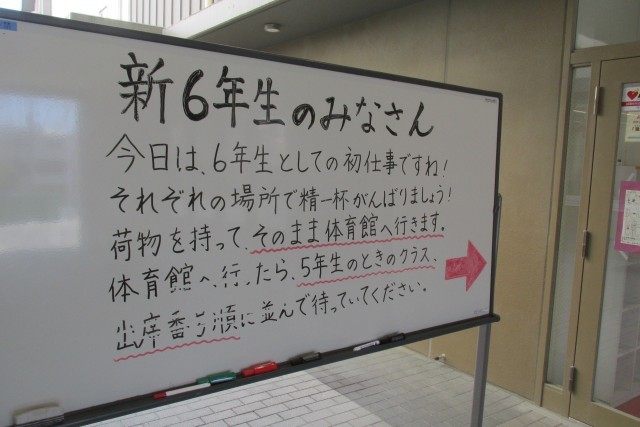 まず各教室の机、椅子の移動や教室の清掃を行い、その後入学式に向けて会場となる体育館の椅子配置、新1年生教室の飾り付け、配布物等分担して作業を進めました。6年生のみなさんありがとうございました。
