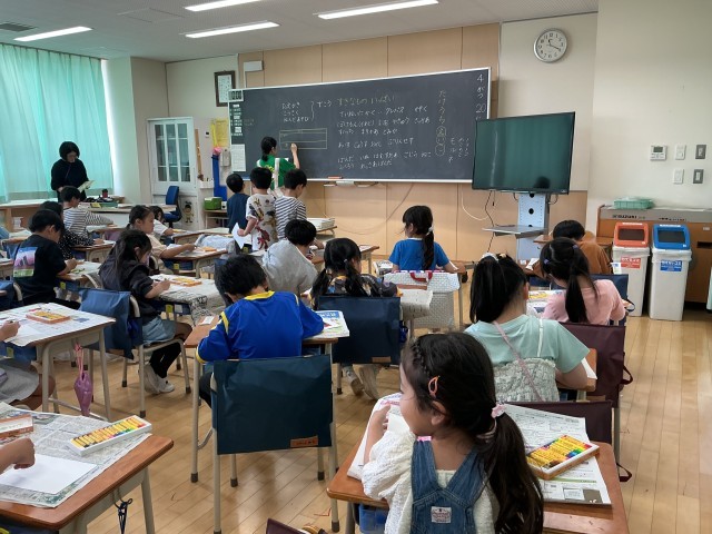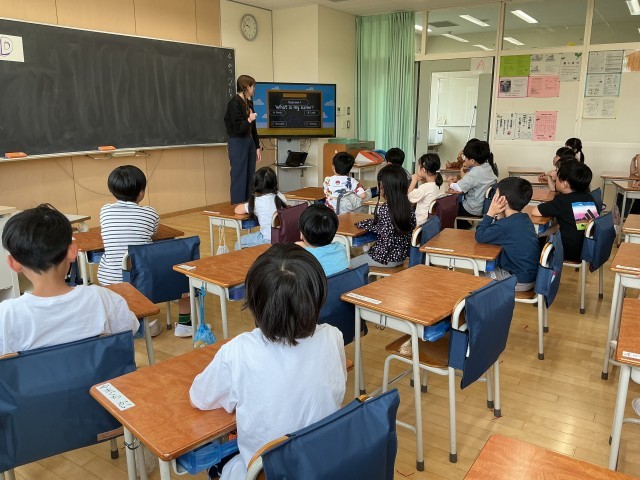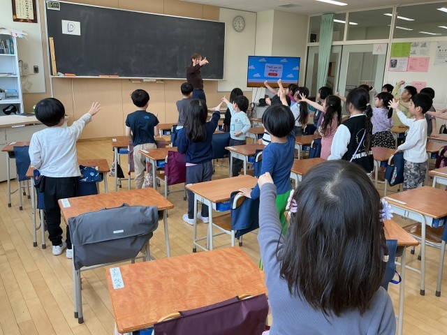 今日は初めての外国語活動がありました。ALTの先生とクイズや英語でじゃんけんをして、楽しみながら外国語に親しみました。「楽しかった!」「毎日やりたい!」と感想を話していました。