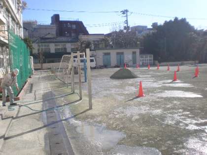 校庭に新しい砂を入れたり、機械でならしたり、塩化カルシウムをまいたり・・・