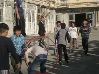 今朝の体育朝会では、フラフープくぐりをしました。