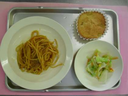献立名 スパッゲティナポリタン コーンサラダ パインケーキ 牛乳