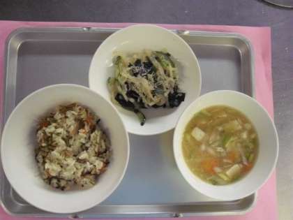 献立名 豚肉とごぼうのごはん 牛乳 味噌汁 じゃこサラダ