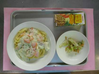 献立名 スパゲッティクリームソース パインキャロットジュース ごぼうチップサラダ