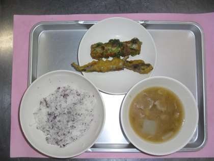 献立名 ゆかりごはん 牛乳 ししゃものカレー揚げ ちくわの磯辺揚げ 豚汁