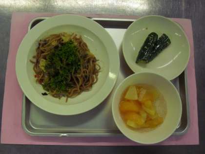 献立名 ソース焼きそば 牛乳 キュウリの中華味 フルーツパンチ