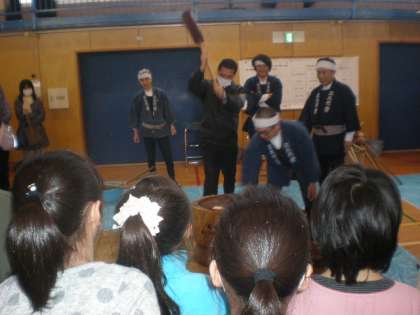 PTA会長も自ら杵を手に、お餅つきです。