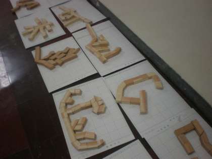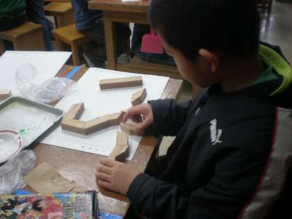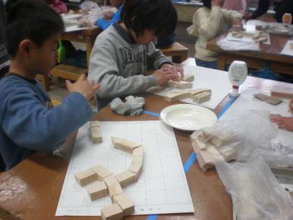 4年生が図工の時間に、自分たちで切った木片をつなぎ合わせて、
