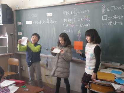 この日は折り紙を使って、分数の仕組みや数の違いについて学習をしました。