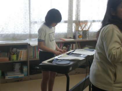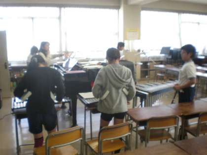 6年生の子たちがお休み時間に音楽室で楽器の練習をしています。