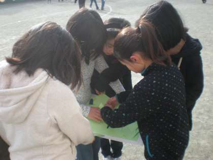校庭に散らばったピースを見つけた子たちが集まってきます。