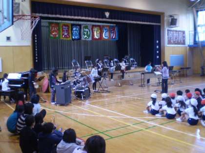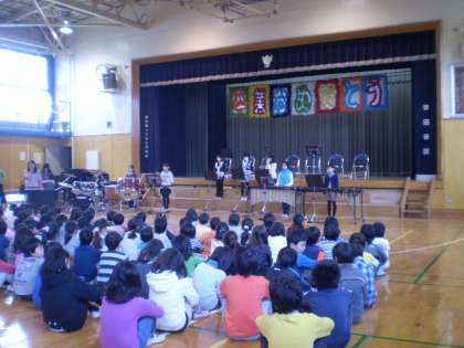 体育館に集まった全校児童を前に、堂々の演奏です。