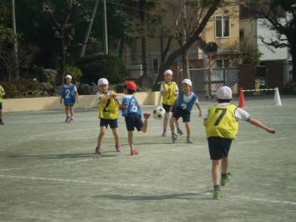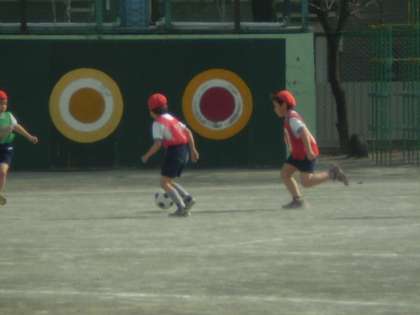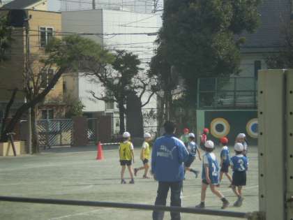 春の陽気の校庭で、子供たちが元気に駆け回っています。