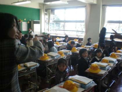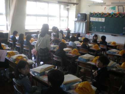 お教室に入ると、黄色い帽子とたくさんの教科書が机の上に置かれていました。