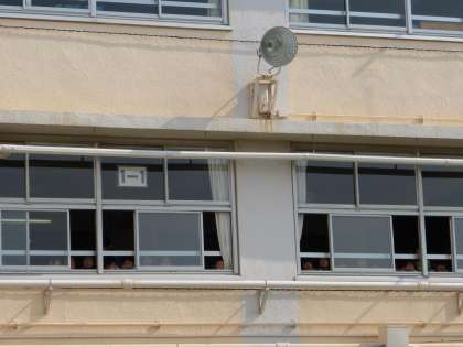 ちなみに1年生は窓から朝会の様子を見学していました。
