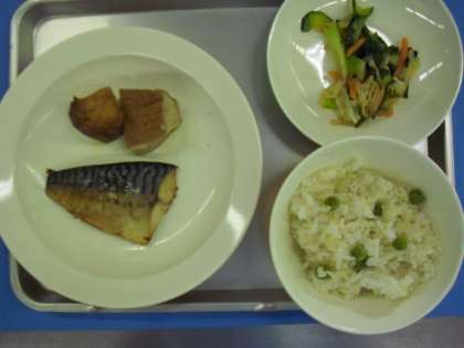 献立名 雑穀入りピースご飯 牛乳 鯖の塩焼き 生揚げの含め煮 和風サラダ
