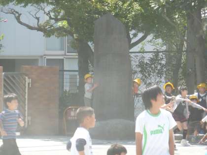校庭でも元気に遊ぶ様子が見られますが、若小の校庭にある石碑で遊ぶのが流行っているようです。