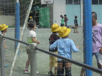 2年生と1年生で一緒にシュートゲームをしたりしていました。