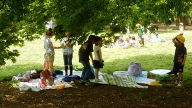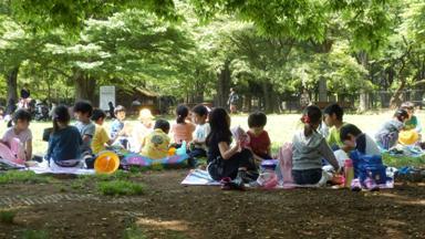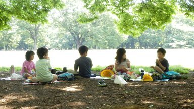 たくさん遊んだ後は、1・2年生いっしょのグループで、仲よくお弁当です。いっぱい動いたので、おなかがすいたらしく、元気よく食べている子が多かったです。