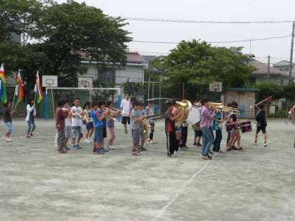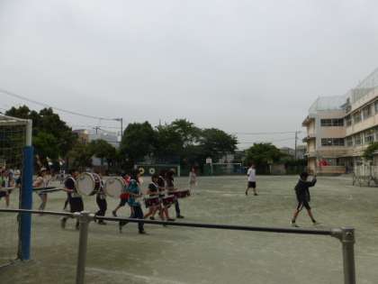 児童朝会の最後は6年生の演奏する若小マーチで行進です。