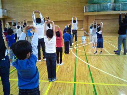 朝会の様子です。みんな元気です。昨日も今日も全員で若小ストレッチをしているところです。
