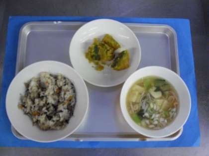 献立名 五目ごはん 牛乳 豆腐汁 かぼちゃの含め煮