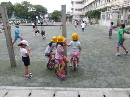 雨上がりの校庭で一輪車に乗っている子がたくさんいました。