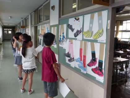 廊下や教室に掲示された作品を見つめる子どもたちの眼差しは真剣そのもの。