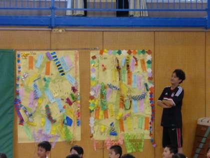 七夕集会に向けて、七夕飾りが体育館に掲示されています。