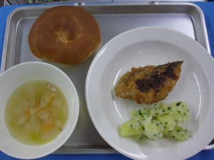 献立名 ミルクパン 牛乳 魚のフライ パセリポテト 野菜スープ