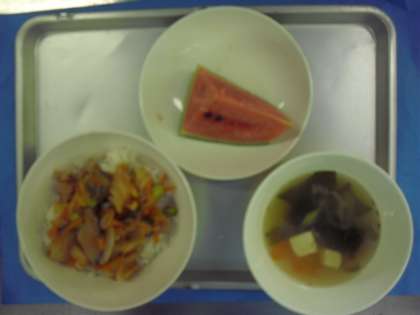 献立名 夏野菜の豚キムチ丼 牛乳 わかめスープ 小玉スイカ