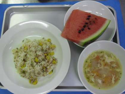 献立名 ナシゴレン 牛乳 トマトと卵のスープ すいか