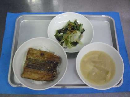 献立名 魚のかば焼き丼 牛乳 冬瓜の味噌汁 わかめサラダ