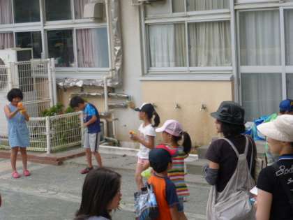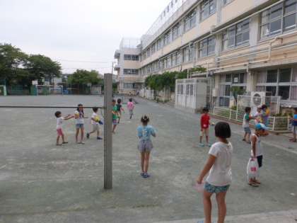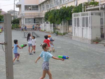 校庭を使った大規模な水遊び大会、若林公園では夕方花火も行われました。