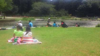のんびりとお弁当を食べています。男の子たちは、トンボに夢中です。