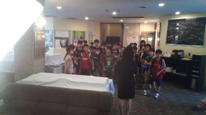 雨が降ったり止んだりの天気のため、早めに宿舎に移動して開校式をしました。支配人さんをはじめ宿舎の皆さんに温かく迎えられ、元気にあいさつで返すことができました。