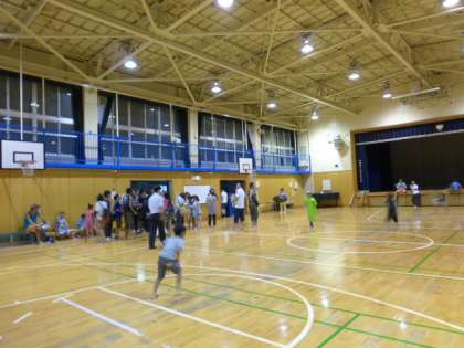 雨をよけるためにたくさんの人が体育館で雨宿りです。