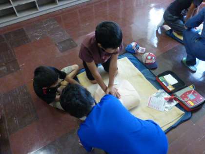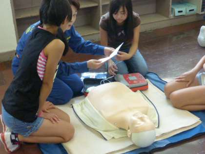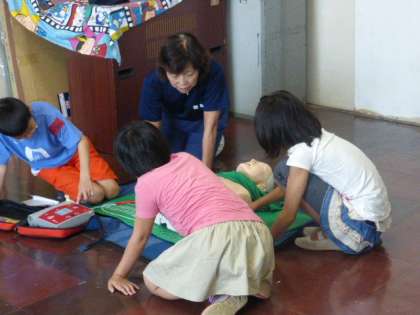 人工呼吸、心臓マッサージとAEDの使い方を経験しました。