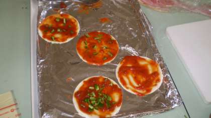 2年生が育てたトマトを使ったソースを生地に塗ります。