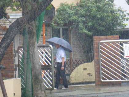 今朝は雨でしたが、いつも通り門の前に校長先生がいました。