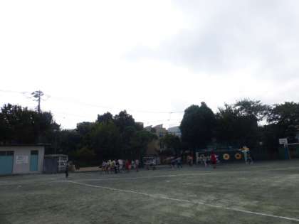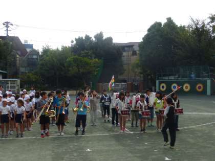 朝会の最後は、若小恒例鼓笛隊による行進です。