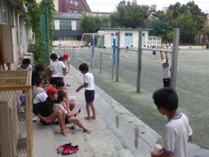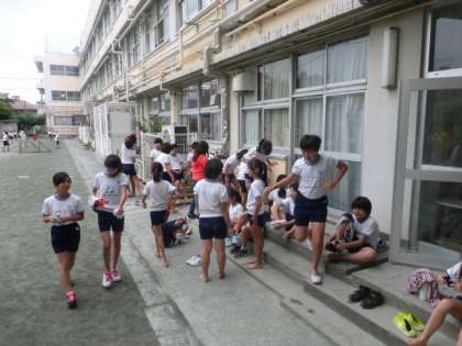組体操の練習を終えた高学年生たちが、玄関のところで足を洗っていました。