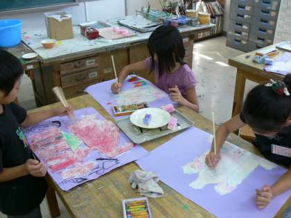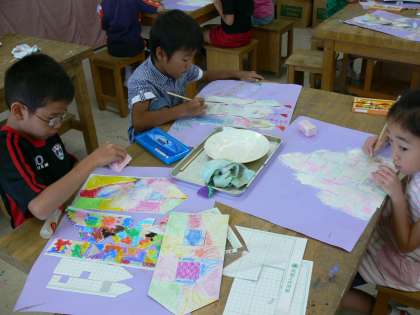 図工では、11月の展覧会目ざして、作品作りをしています。2年生は、「すてきなおしろ」という題で平面作品を作っています。みんな一生けんめいにとり組んでいました。