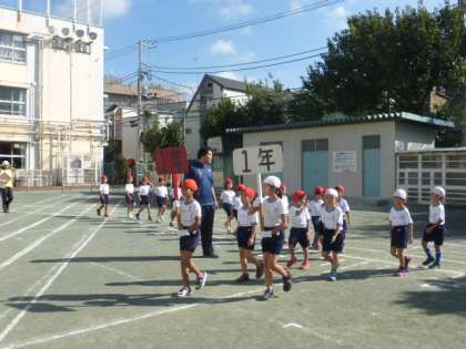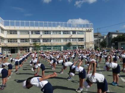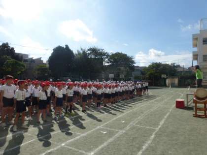 爽やかな青空の下、みんなやる気満々の若小全校児童。
