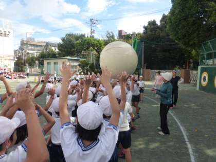 全校競技の大玉送りの練習は赤白の引き分けで、勝負を預けています。