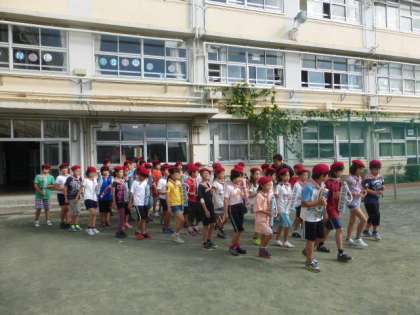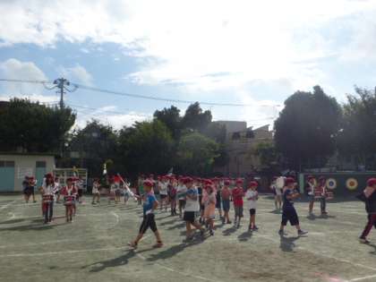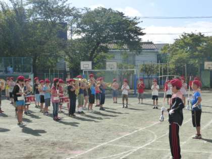 5、6年生で組織している若小鼓笛隊が校庭に登場しました。