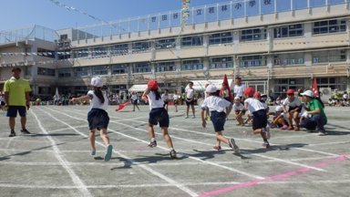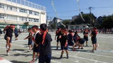 初めての小学校での運動会に1年生は元気いっぱい頑張りました。ニンニンにんじゃでは、けがで出場できない友達と決闘シーンを演じとても楽しそうでした。